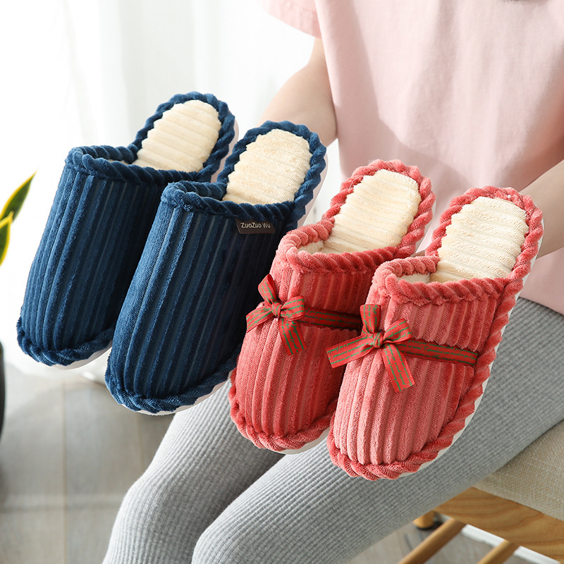 新しい快適な家の蝶結びの保温冬の綿のスリッパのカップルの男女の厚い底の柔らかい靴は厚くて滑り止めがあります。