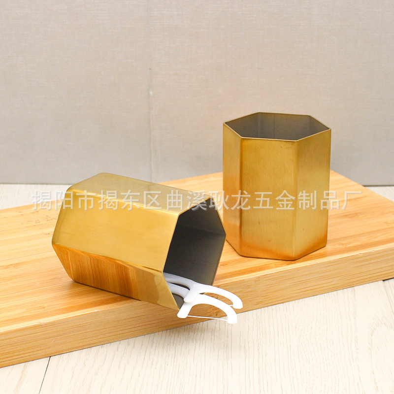 ステンレスのつまようじの箱のホテルの客間の六角形のつまようじの缶のアイデアの金色の広告はロゴのつまようじの筒を決めます。