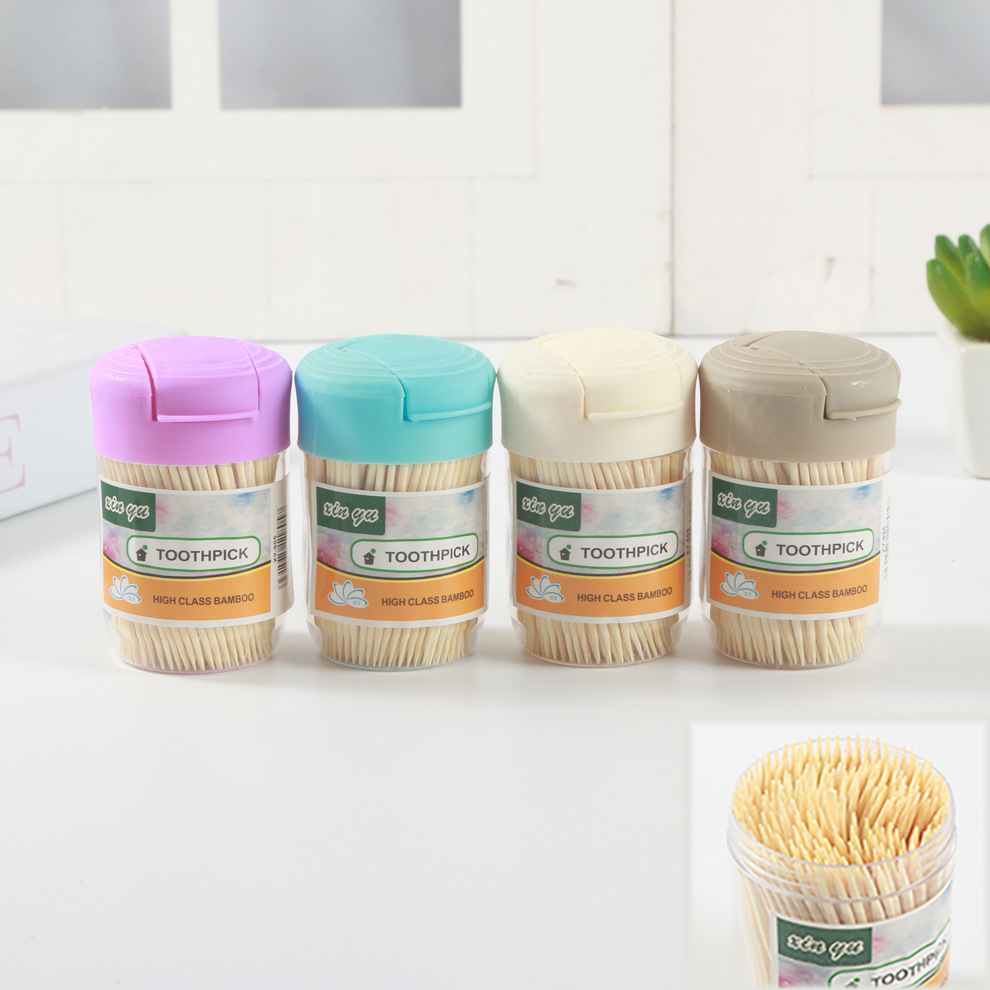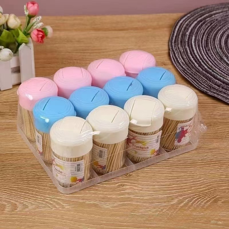 家庭用使い捨て筒につまようじを入れたカラープラスチックのふたをひっくり返したつまようじ筒家庭用瓶の両端のつまようじ卸売り