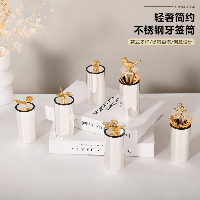 家庭用の軽い豪華な風は銀のつまようじの筒をめっきして圧力式のお茶のいくつかの置物の装置のつまようじのステンレスのつまようじの筒を押します。