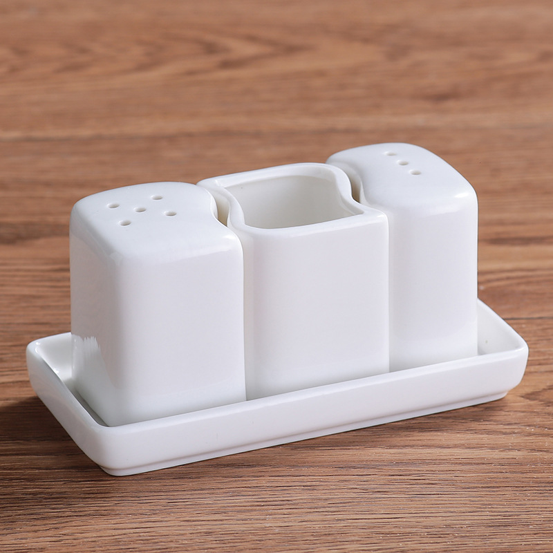 陶磁器の味具セットのレストランはテーブルの楊枝筒の胡椒の瓶を並べて組み合わせて業務用のお茶のレストランの中華料理の味具の磁器を並べます。
