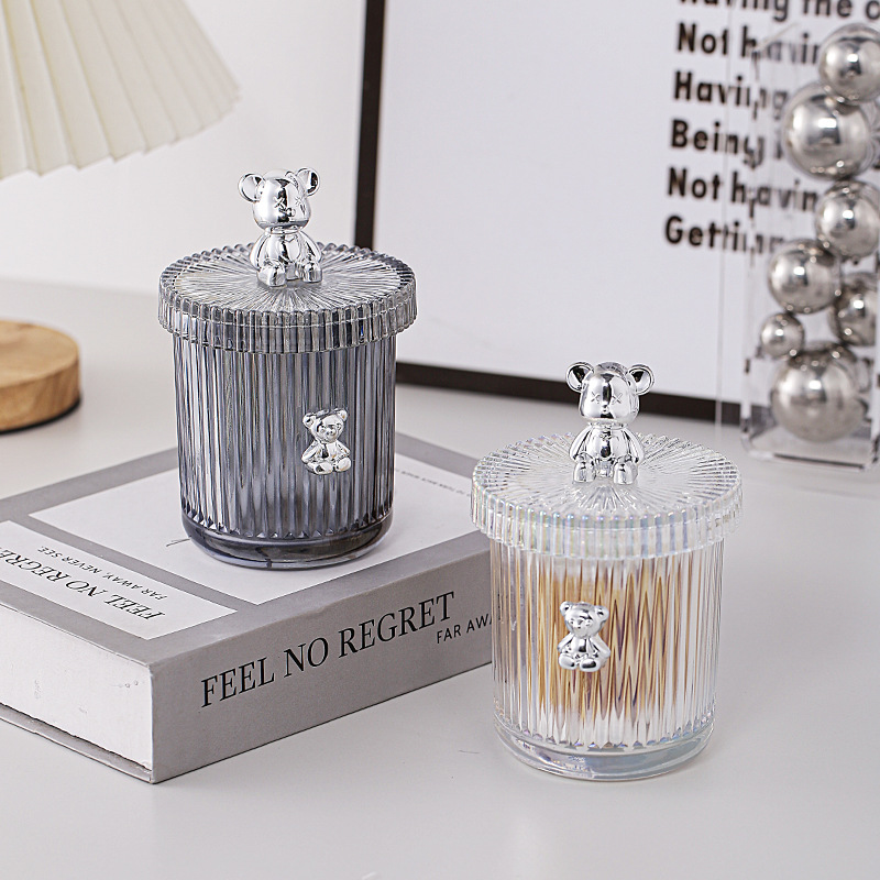 シンプルなストライプグラス蓋付き綿棒カップ家庭用デスクトップ収納カップ高颜値ジュエリー収納缶