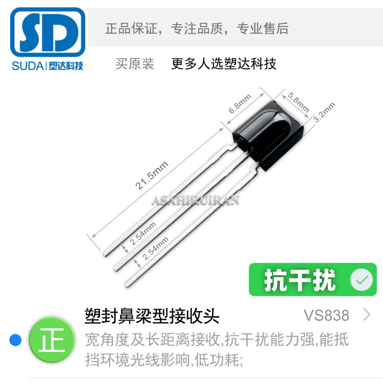 CHQ1838赤外線受信ヘッド純正品鼻筋型鉄殻リモコン受信管VS1838B受信ヘッド