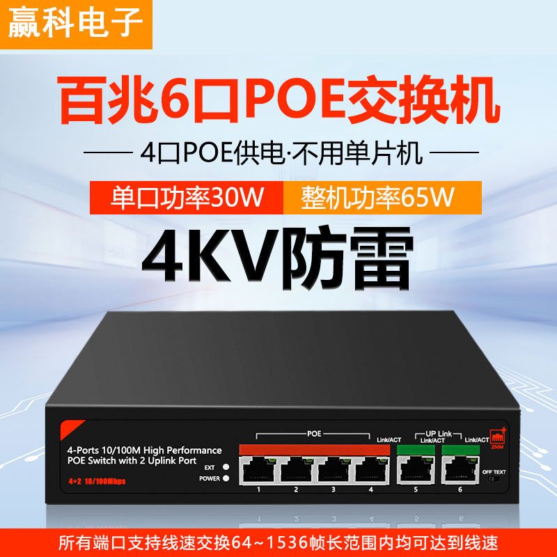 65w百兆6ポートpoe国標高速スイッチ4ポート給電4kv防雷標準pseプロトコル単口30w