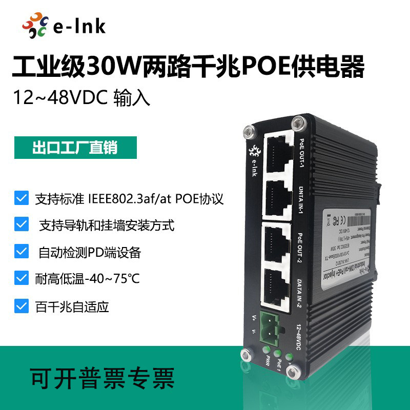 二路工業級ギガpoe給電器高出力30wpoe 12 ~ 48v dc入力セキュリティ監視用