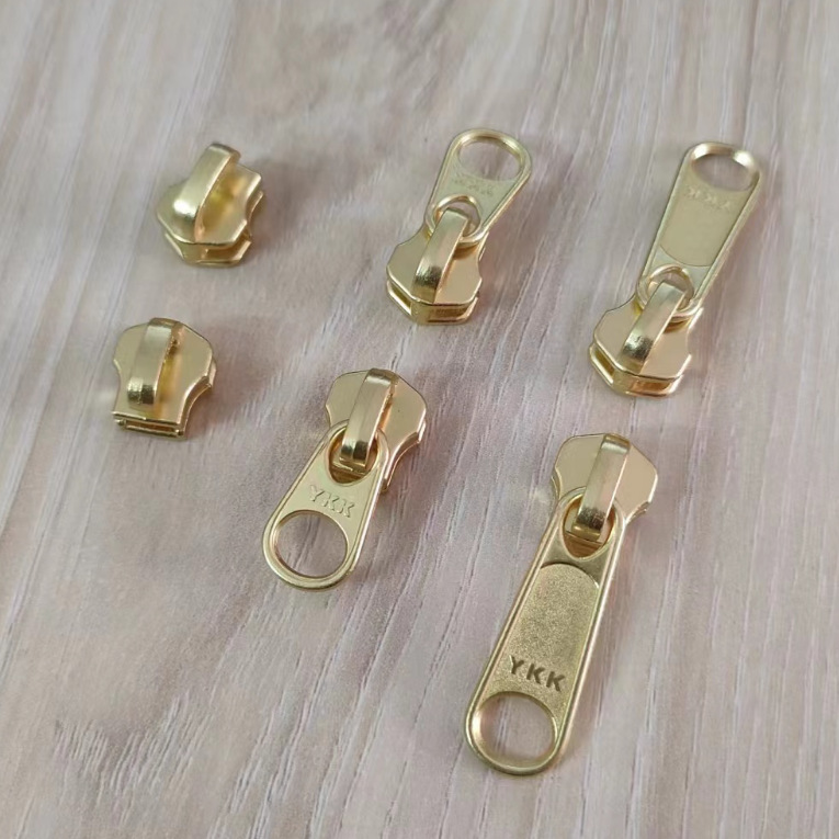 現物の高級金属の頭を引く服装の包みの3号の5号の金属は電気の薄い金色のファスナーの頭の現物を掛けます。