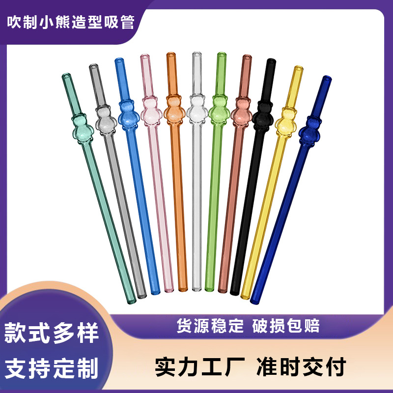 現物高ホウ素シリコンガラスストローカラー透明かわいいベアー造形ストロー環境保護ストローセットプレゼント