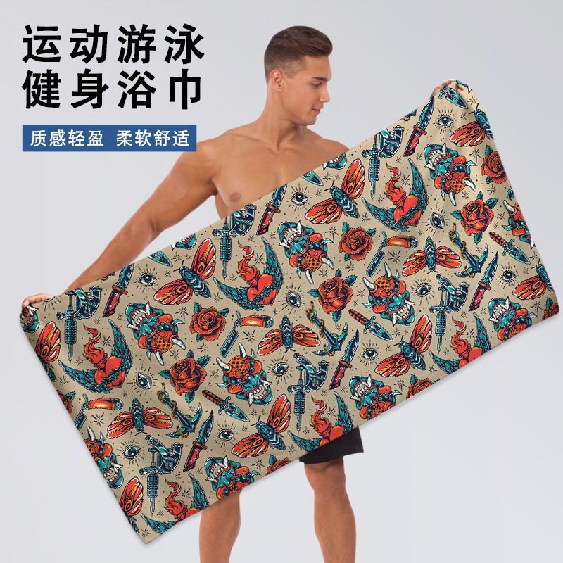 新しいヨーロッパとアメリカのレトロなタトゥーバスタオルメンズジムスポーツ大型タオル速乾性吸水性水泳バスタオル