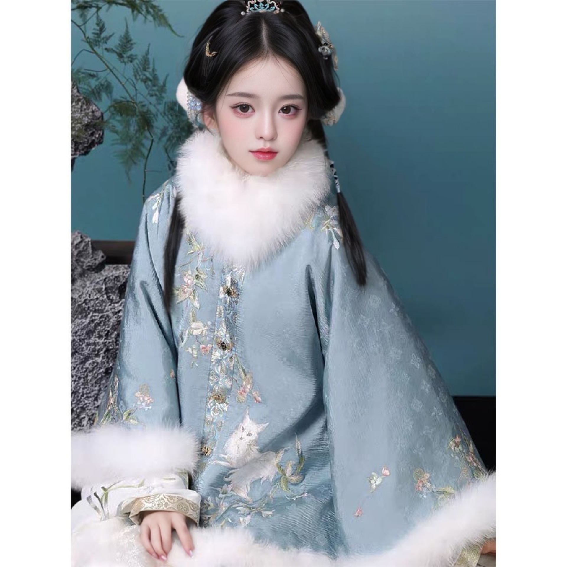 本物のレッキスラビットファー、秋冬子供服、漢服、チャイナドレス、袖口レース、クリスマス装飾帽子、白いマント、衣類アクセサリー