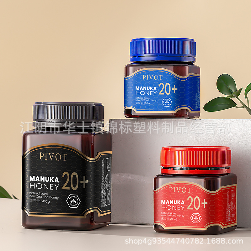 ペット食品グレードマヌカスクエア透明遮光盗難防止カバーハニーボトル 250 グラム 300 グラム 500 グラム 1000 グラム