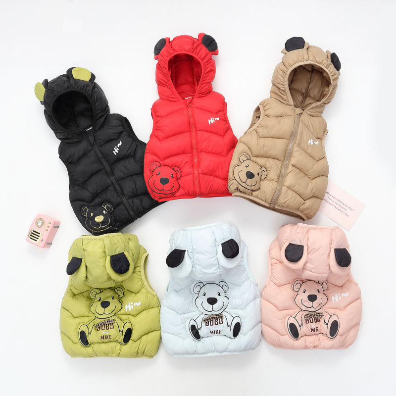 2025秋冬の軽薄でソフトで快適な熊のプリントと帽子の馬甲の中の子供の赤ちゃんと帽子のかわいいベスト