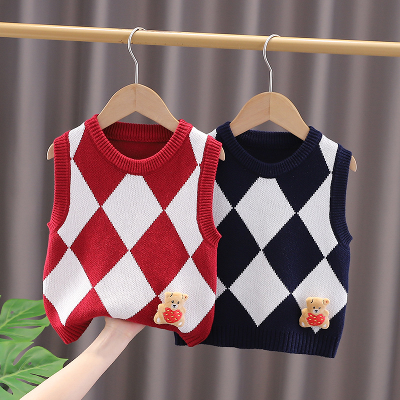 外国貿易の子供服の工場の2024新型の子供のセーターの韓国版の10項の大きいダイヤモンドの赤ちゃんの袖なしの馬の甲の洋の空気の熊