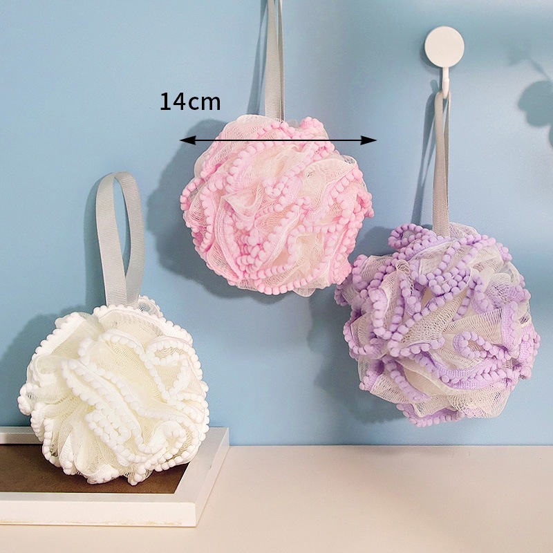 花が飛ばないPEバスボール、超柔らかいバスレースバスボール、大きなサイズ、柔らかく泡立ち、快適な背中こすり