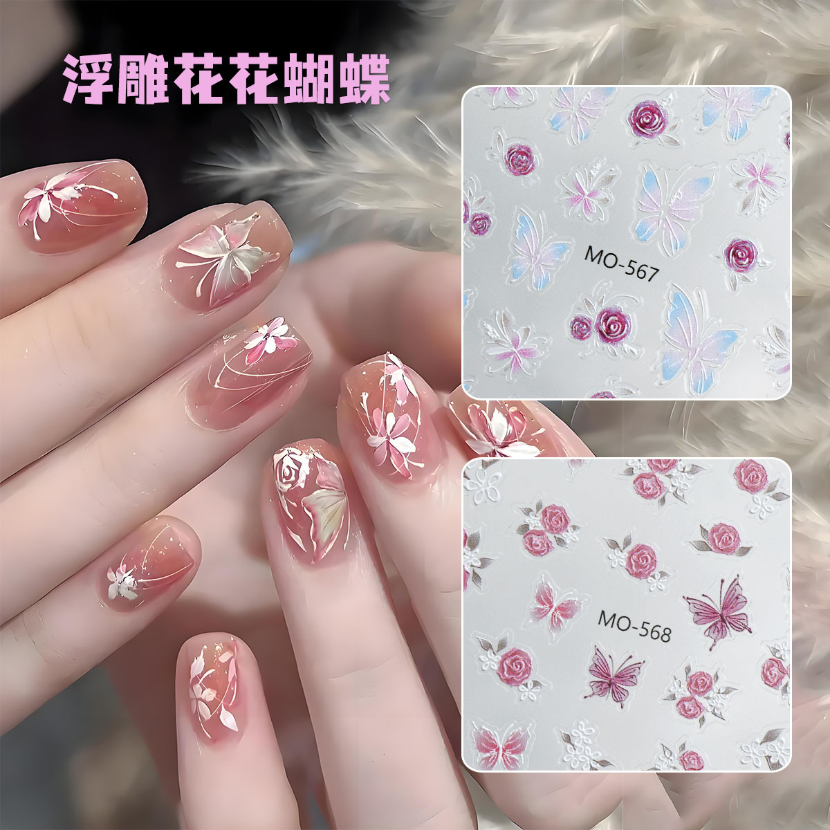 インターネットセレブ人気エンボスフラワーバタフライネイルアートステッカーブルーピンクバタフライローズライト高級ハイエンドネイルアートステッカー