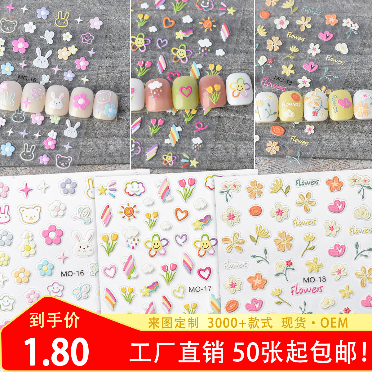ネット赤浮き彫りチューリップ虹ネイルシールかわいいウサギ花星芒爪ステッカー卸売り