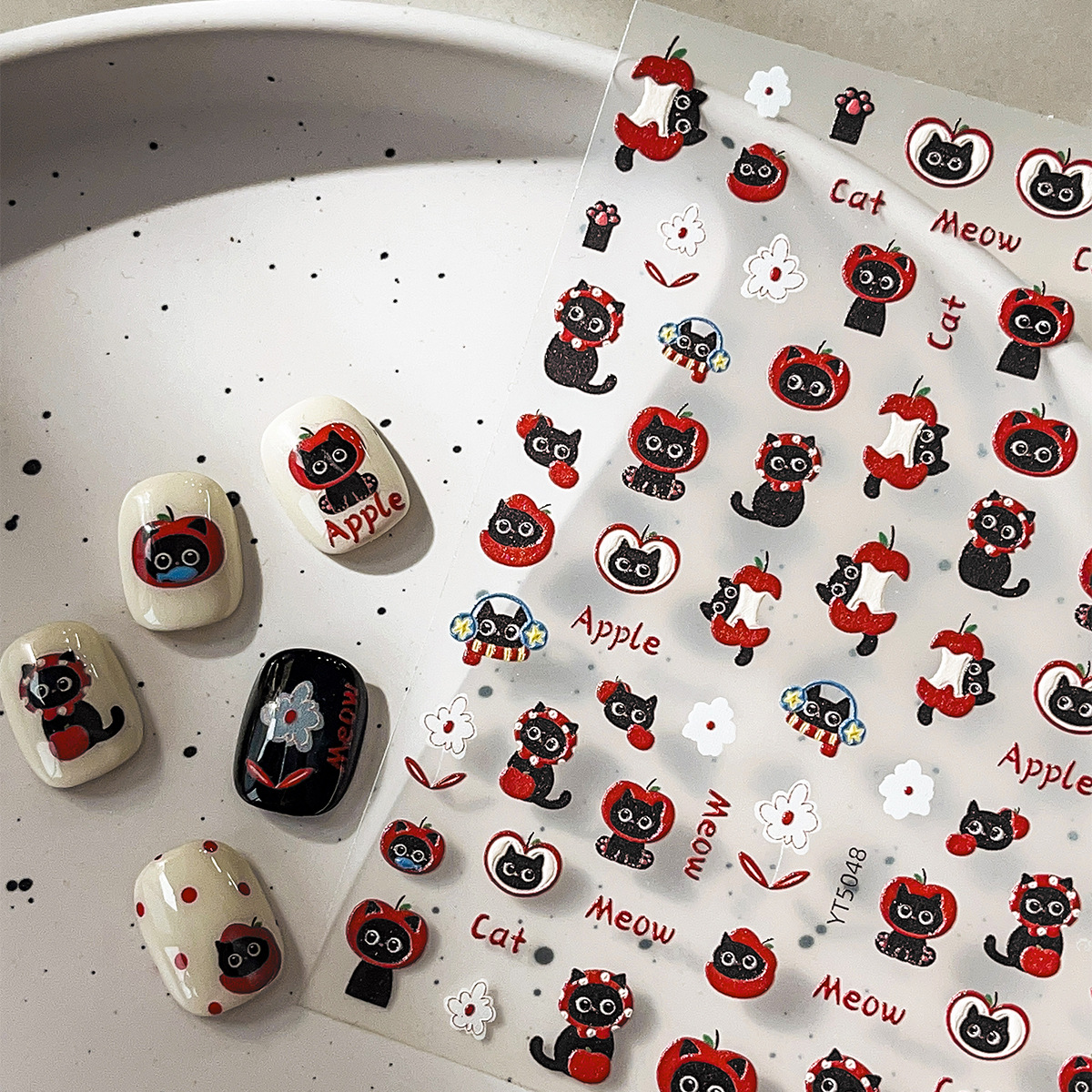赤いリンゴの黒猫の立体のネイルシールのかわいい漫画の落書きの手描きのゴムの爪のデカールアクセサリーの卸売り