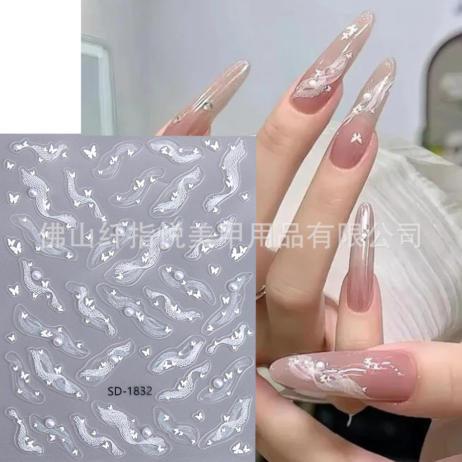 国境を越えた新しいネイルシール3D真珠レース蝶ネクタイ白い蝶バックゴム爪デカール装飾品