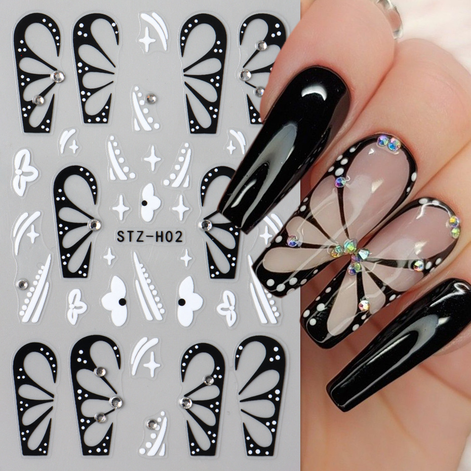 国境を越えた新しいネイルシールins高級感のある黒い透かし彫り蝶の羽には、小さな花の線の爪がついている