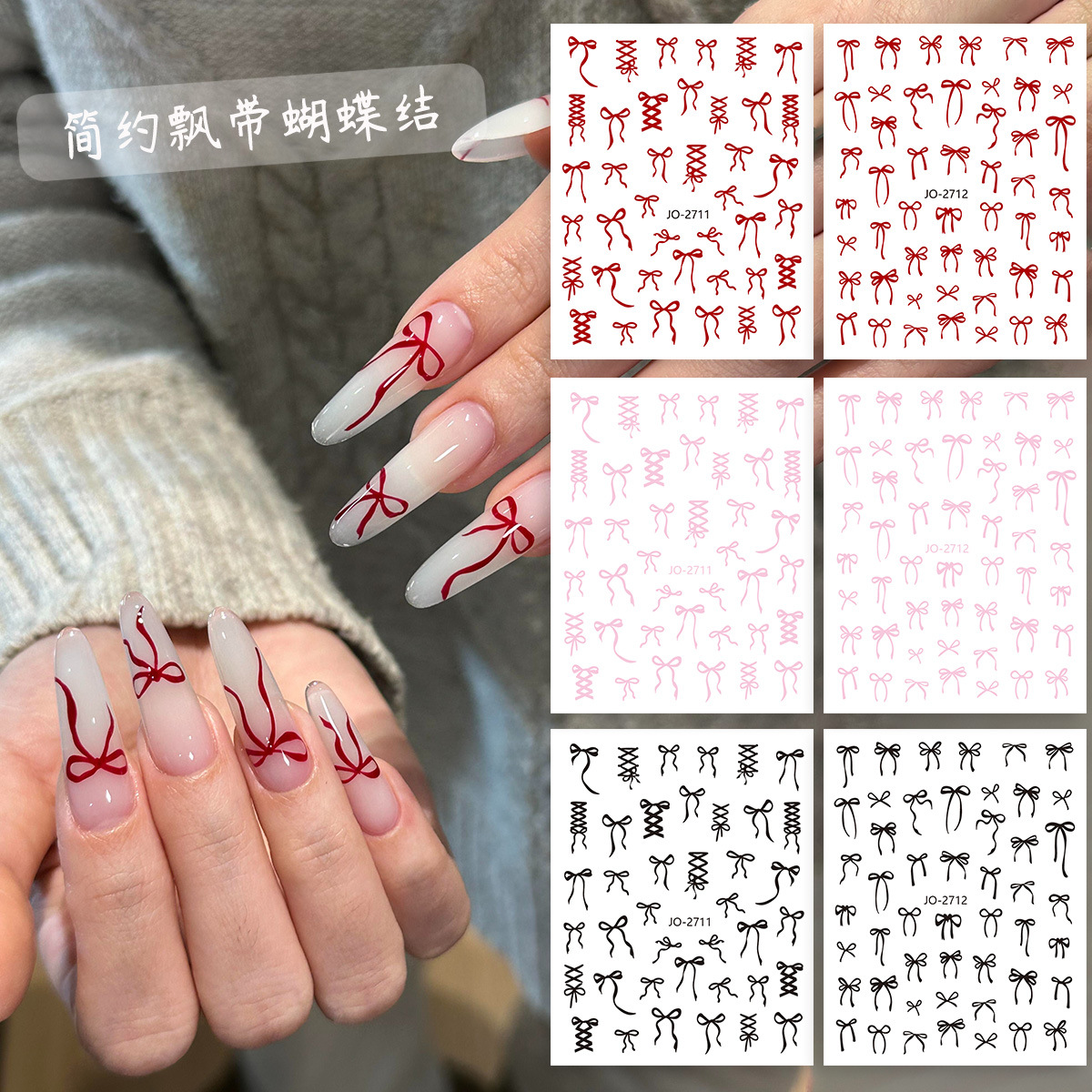 ネイルアートステッカー蝶ネクタイウェアラブルネイルパッチ粘着裏地付き超薄型赤、ピンク、黒のネイルデコレーション