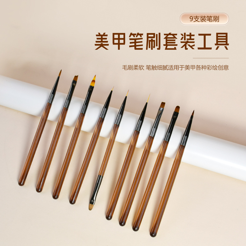 9本の茶色のネイルブラシのセットの日本式ネイルペンのブラシはペンの半透明の棒の光を掃きます。
