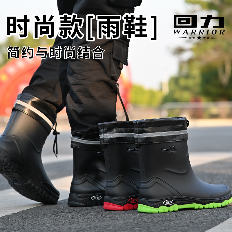 韓国風ショートチューブファッションメンズレインブーツピュアブラックウォーターシューズライダーウェーディングブーツレインブーツミディアムショートチューブカフ反射ストリップラバーシューズ