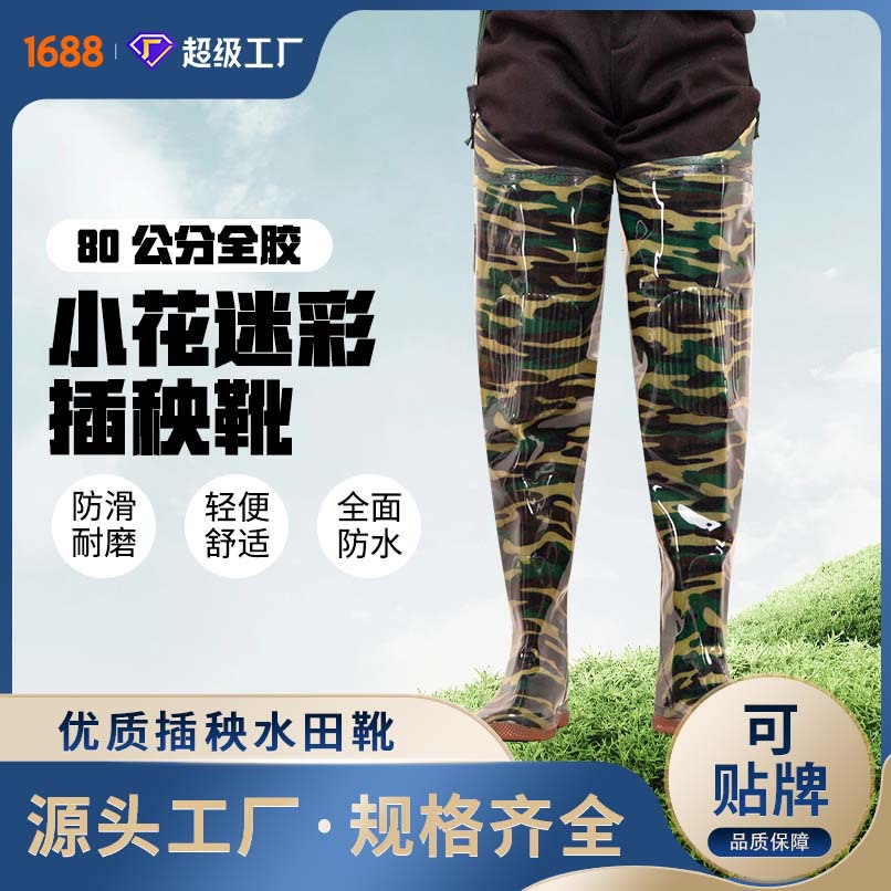 迷彩柄80cm長水田作業靴、水田用靴、防水パンツ、迷彩柄長め厚手膝丈