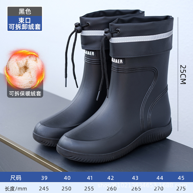 厚みのある労働保護メンズレインブーツ、ハイチューブショートレインブーツ、防水、滑り止め、厚みのあるベルベットカバー、耐酸性および耐アルカリ性ウォーターシューズ、キッチンラバーブーツ