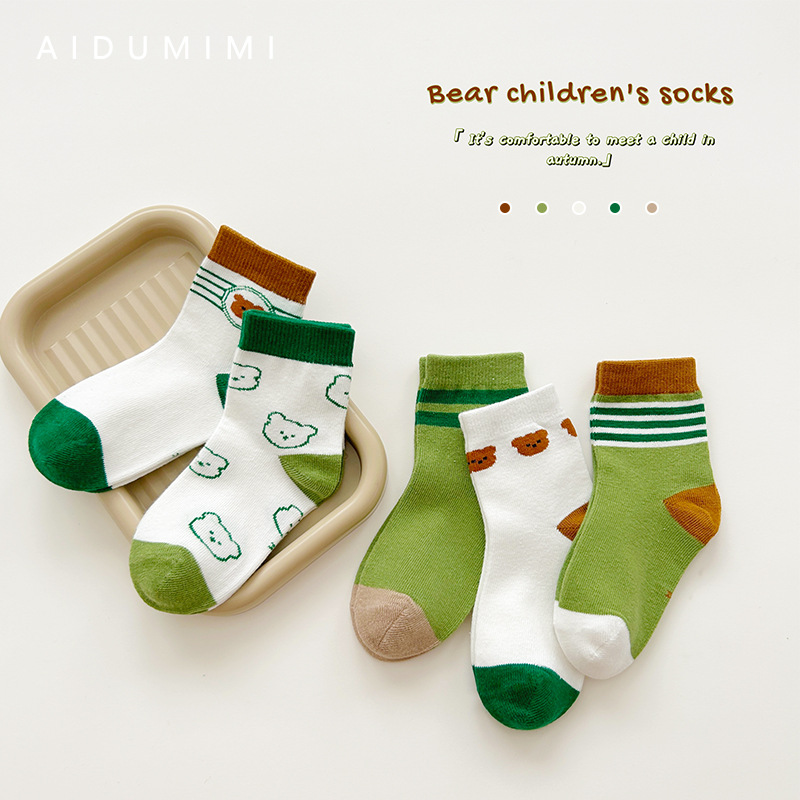 子供用靴下 秋冬 クマ柄 漫画風 韓国風 春秋 通気性 吸汗性 ミドル丈 綿靴下 男の子 女の子 レターソックス