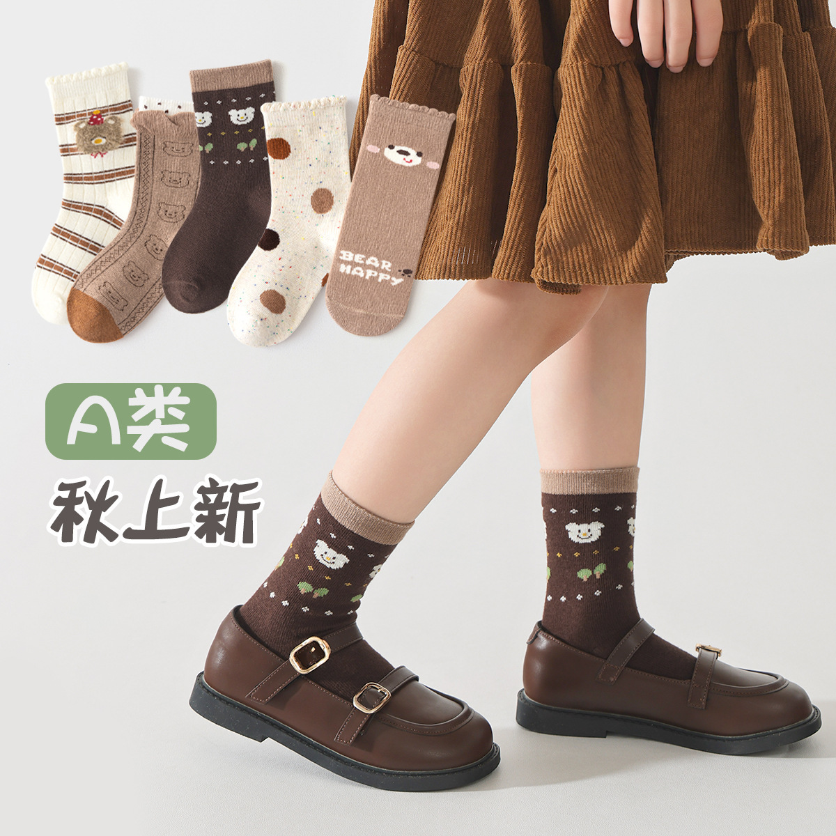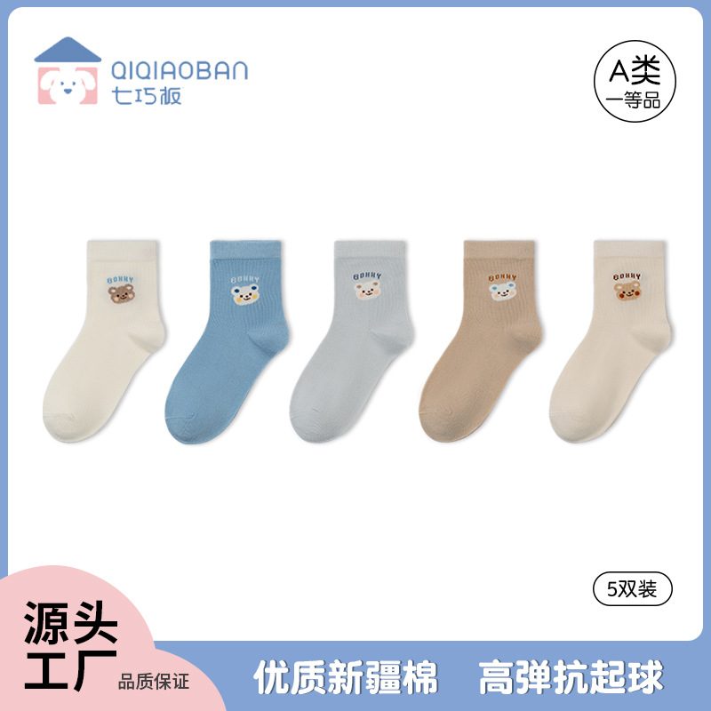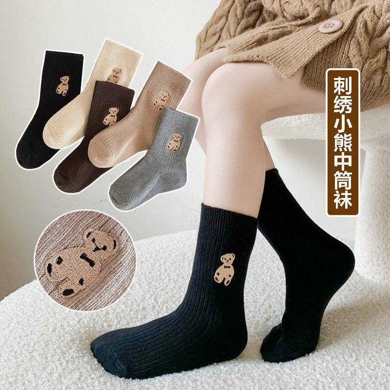 子供用靴下秋冬中筒綿靴下女児刺繍熊レトロ純色ins潮韓版a類赤ちゃん靴下