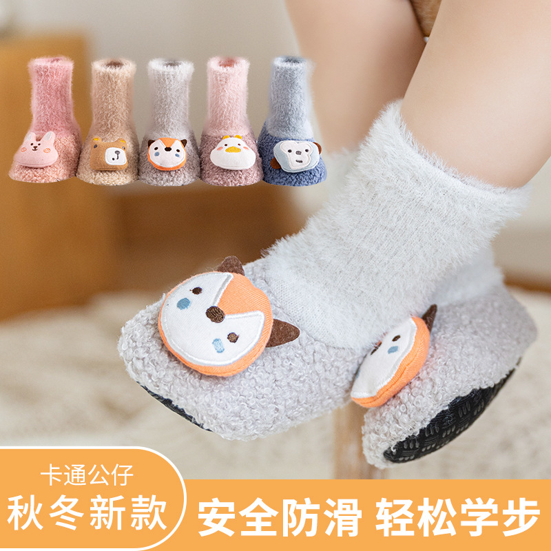 21秋冬の新型の厚いサンゴの毛の赤ちゃんの床の靴下の赤ちゃんの靴の靴下の漫画の子供の中で筒の子供の学校の靴下