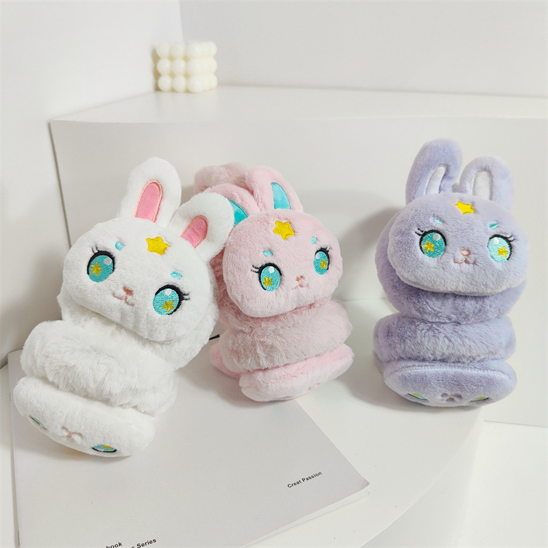 新型アニメのウサギのぬいぐるみは耳を折って、冬の女の子は防寒して耳を保護します。