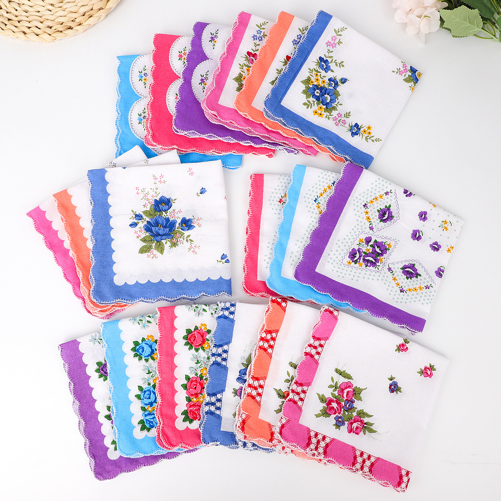 広辺カラー歯辺プリント女性ハンカチ綿旧式ハンカチ純綿女性ハンカチクロスボーダー28*2