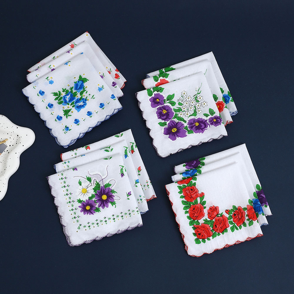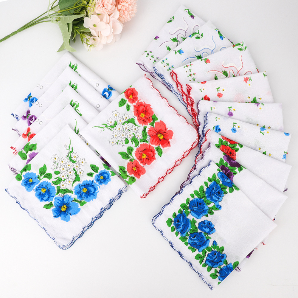 歯の縁のプリントの女性のハンカチの白地の純綿のハンカチの田園風の小さい花の方のタオルの古い女性のハンカチの越境の29cm