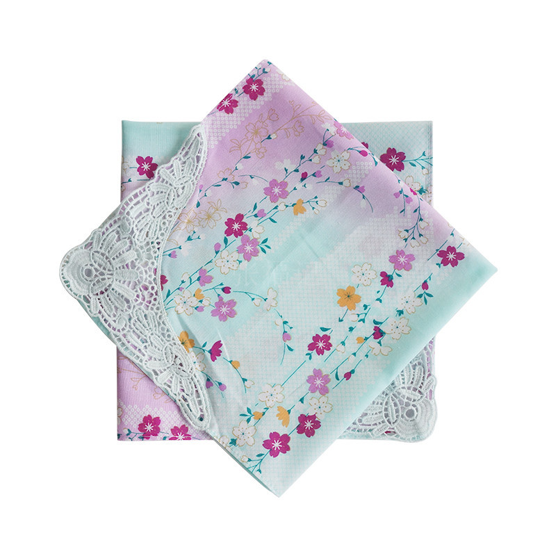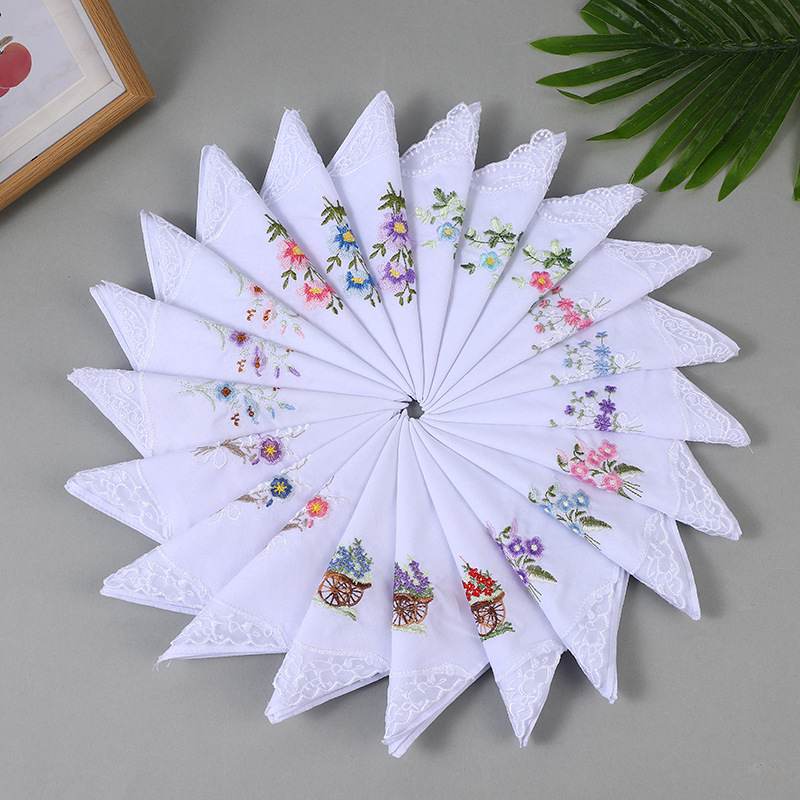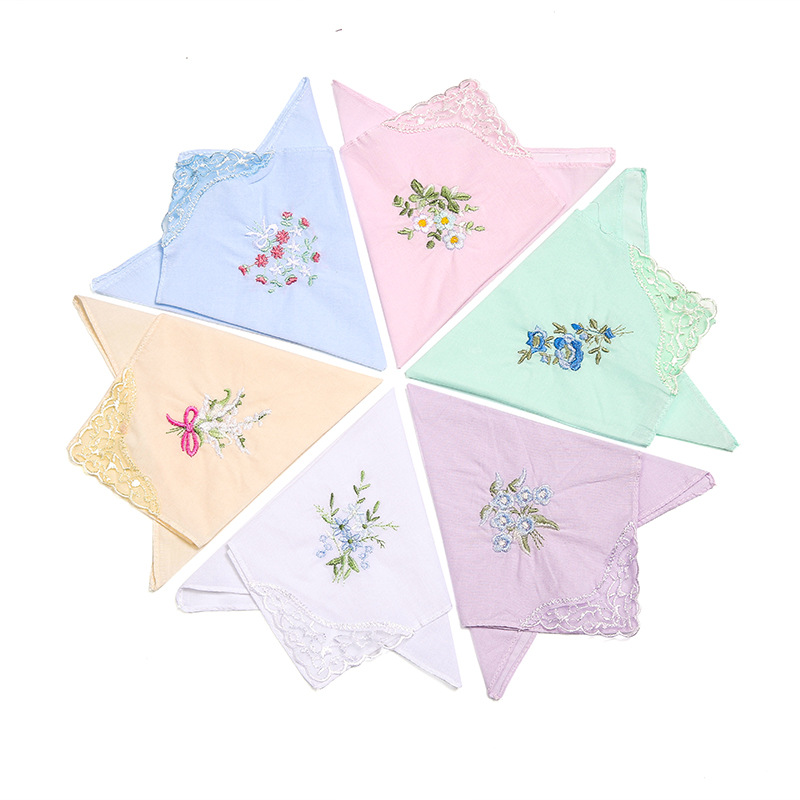 2024新型女性平織り刺繍花付きレースエッジ綿多種類ハンカチレース手ぬぐいメーカー卸売り