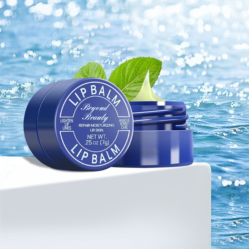 青い缶の水が潤いを与えて、リップクリームを保湿して、リップクリームを保湿します。