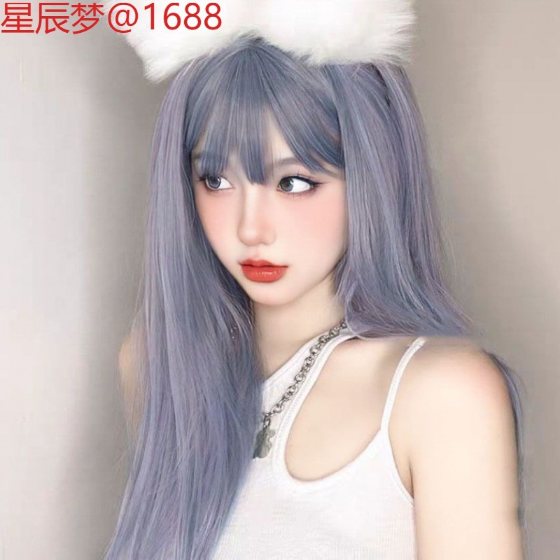 ロリータソフトガールスモークグレーブルーかつら男の子と女の子ユニバーサルエア前髪ロングストレートヘアインターネット有名人かわいい COS 偽毛