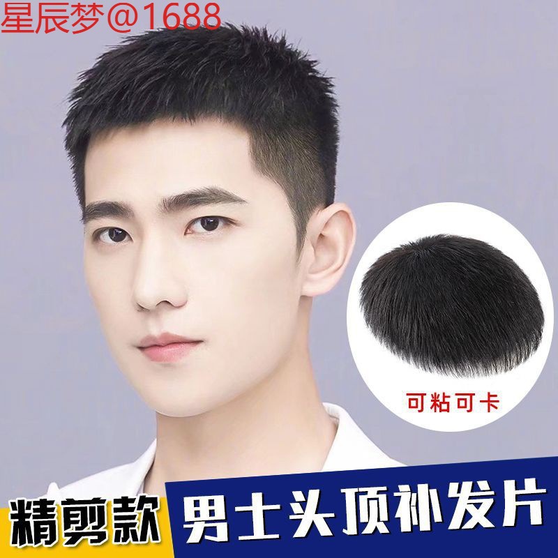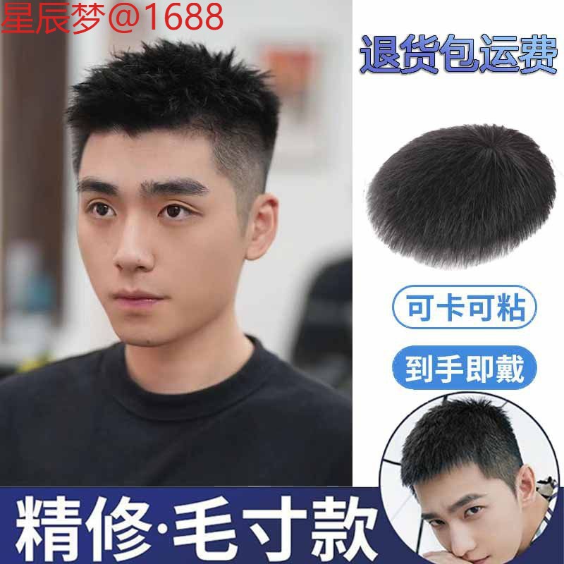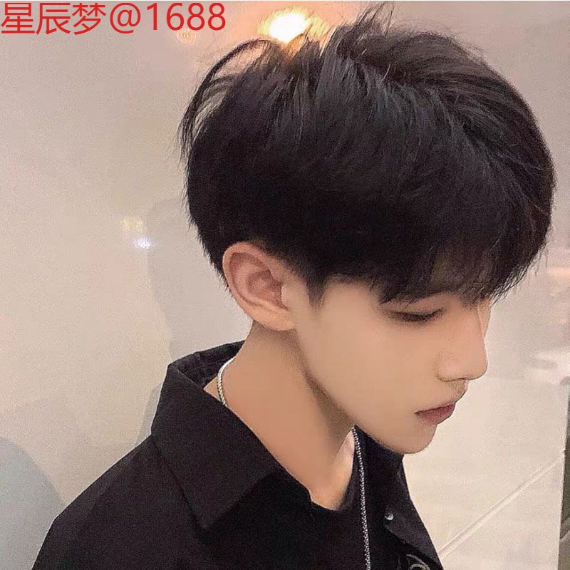 ショートヘアの男性用偽ヘッドギア、中間分けカバー、若者ネット有名人、黒韓国版トレンディな自然シミュレーションショートストレートヘアフルヘッドギア