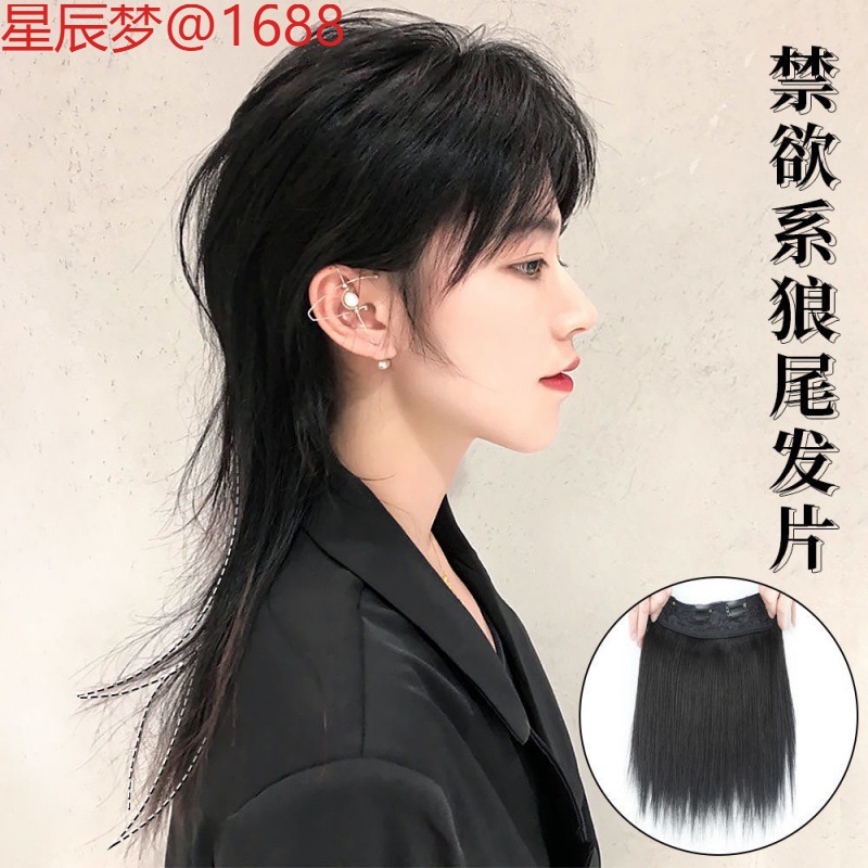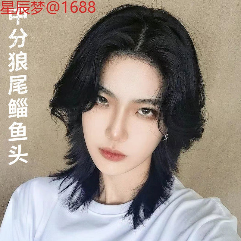 男性用ウィッグ、ウナギテール、和風、マイクロカール、中間分け前髪、オオカミテール、ネットセレブ写真撮影、ロングヘア、フルヘッドギア