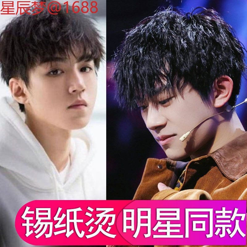 男性用ウィッグ、ホイルパーマ、韓国風、ハンサム、ふわふわ、おしゃれなインスタントラーメンカール、本物の髪の頭上ヘアピース、男性用、女性用ウィッグ