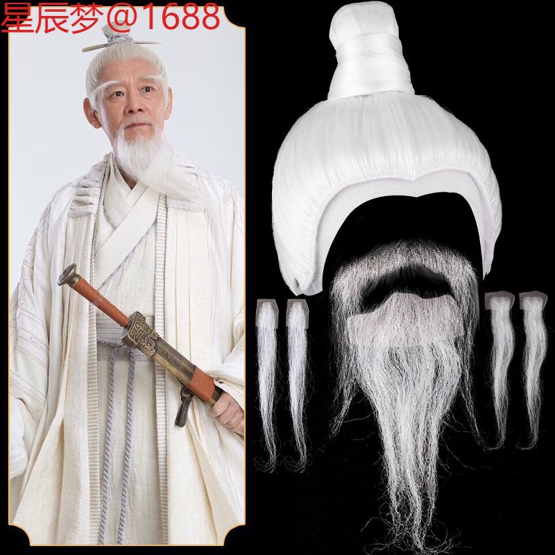 古代映画とテレビの孔明と法海の白い男性用ウィッグ、ヘッドギア、手かぎひげ、パフォーマンス写真、コスナチュラルのフルセット