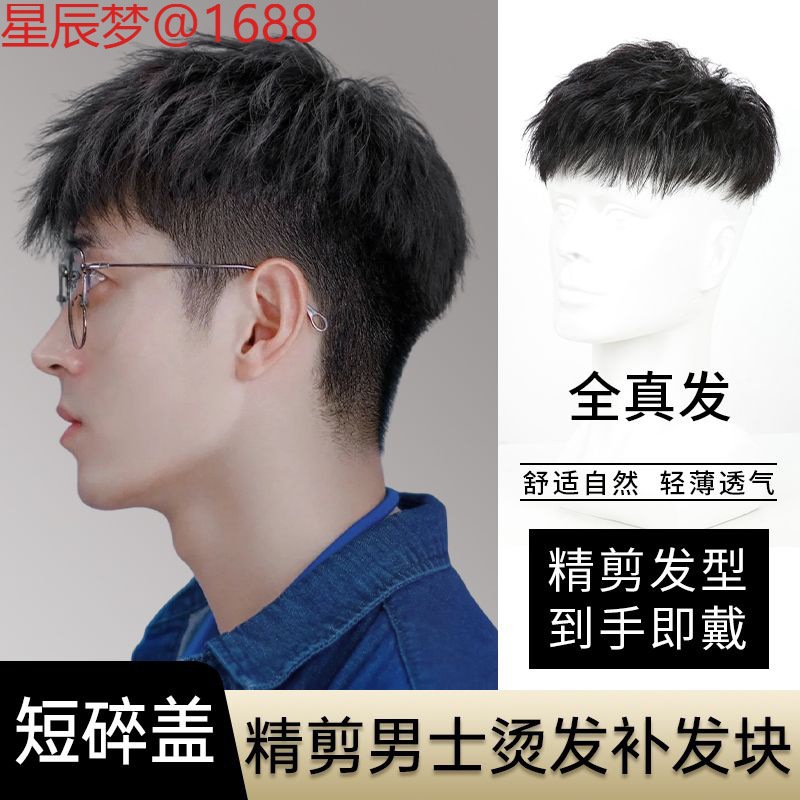 ショートヘアの男性用ウィッグ、完全な本物の髪、目に見えない、痕跡なし、韓国版、ハンサムなクラッシュキャップ、テクスチャードパーマ、軽くて通気性のある頭頂部の交換用ヘアピース