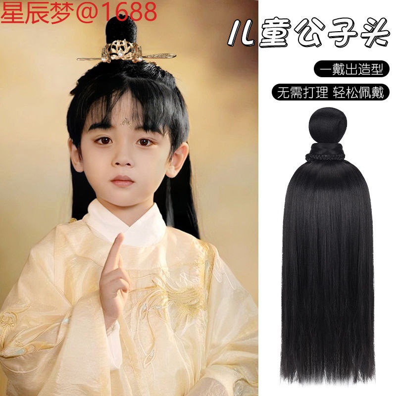 子供用漢服古代風オールインワンウィッグバッグ男の子古代衣装木製ヘアピン怠惰な学生額ヘアバンドスタイル帽子