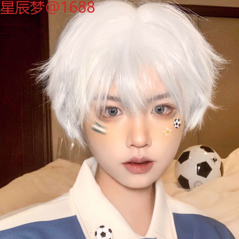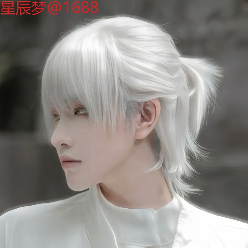 男性用ウィッグ、アニメ風、純白ショートヘア、カット前髪、白髪コントロール、カットヘア、cosユニバーサルQisiliフルヘアセット