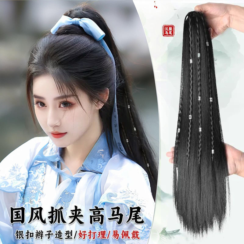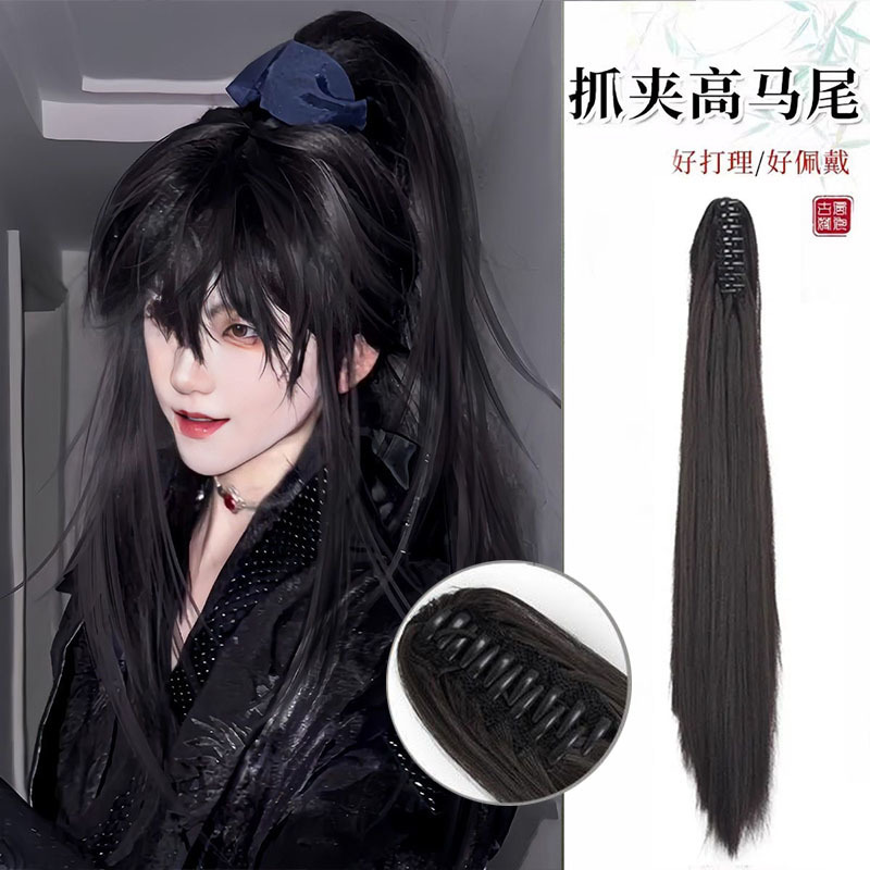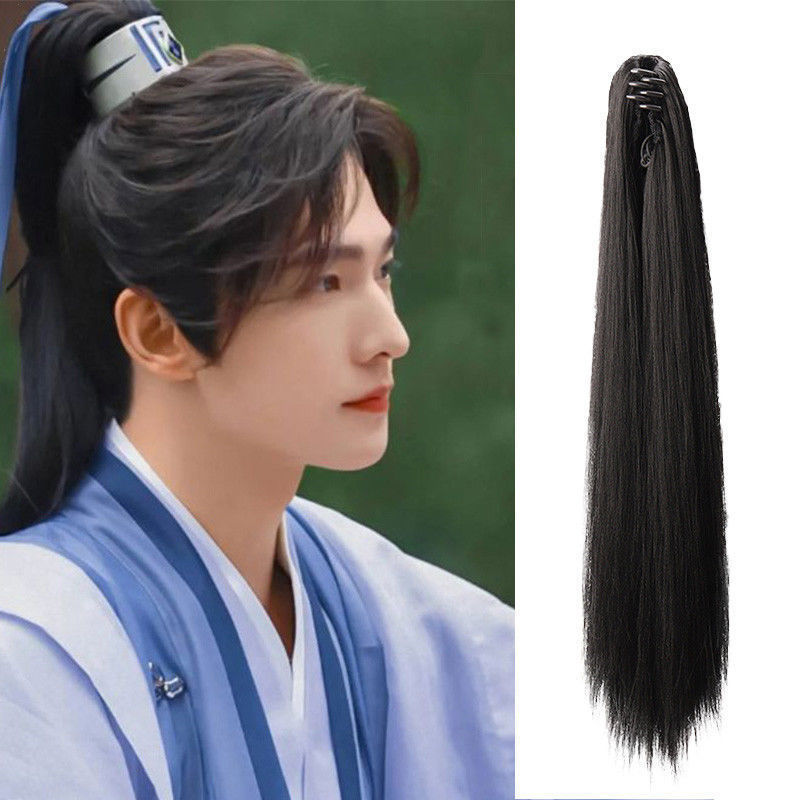 古代風漢服ウィッグ男性虎口クリップオンハイポニーテールcosロングストレートヘアナチュラルでリアルな三つ編み女性アクセサリー