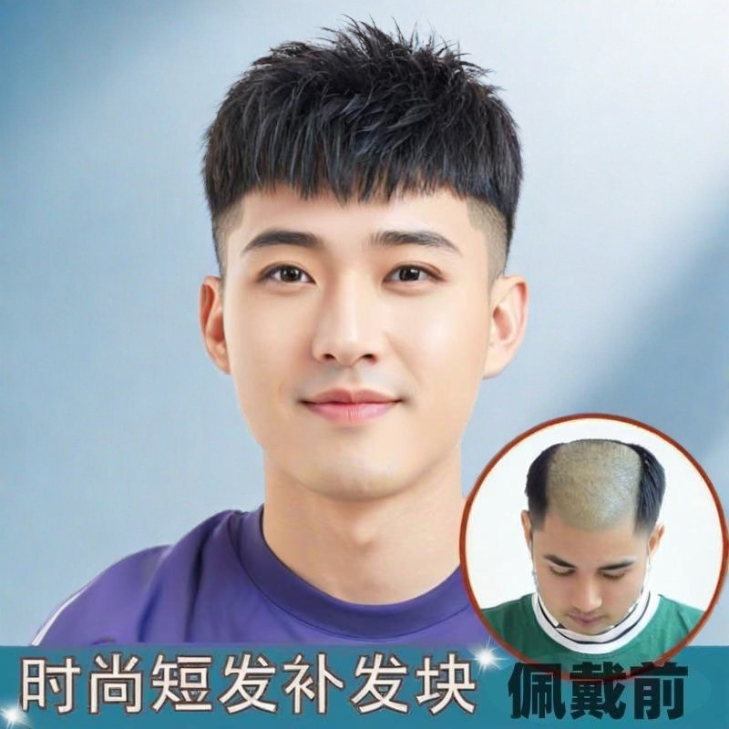 偽毛の男性のショートヘア、ハンサムなヘアスタイル、本物の髪、自然に見えない、痕跡のない、薄い男性の頭の上に再植されたヘアピース