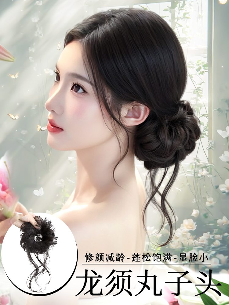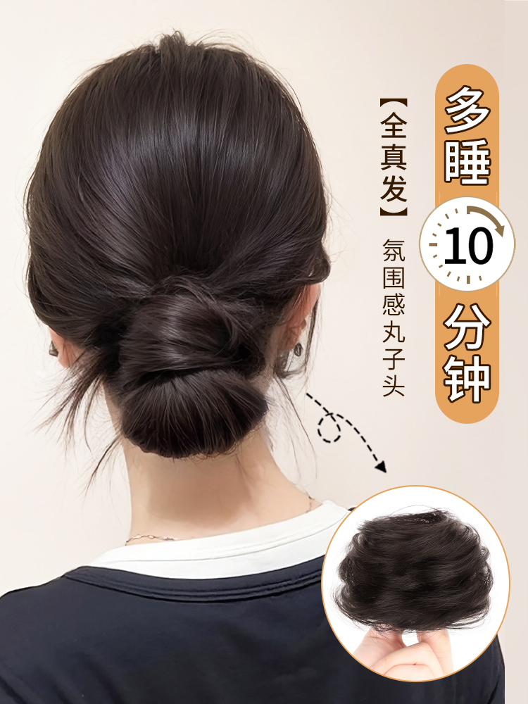 低束真髪団子頭かつら髪輪髪包全真髪ふわふわ盤髪神器かつら花つぼみ頭