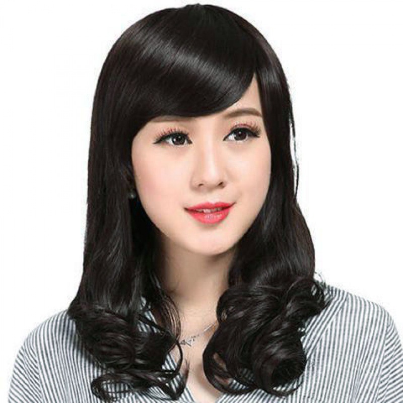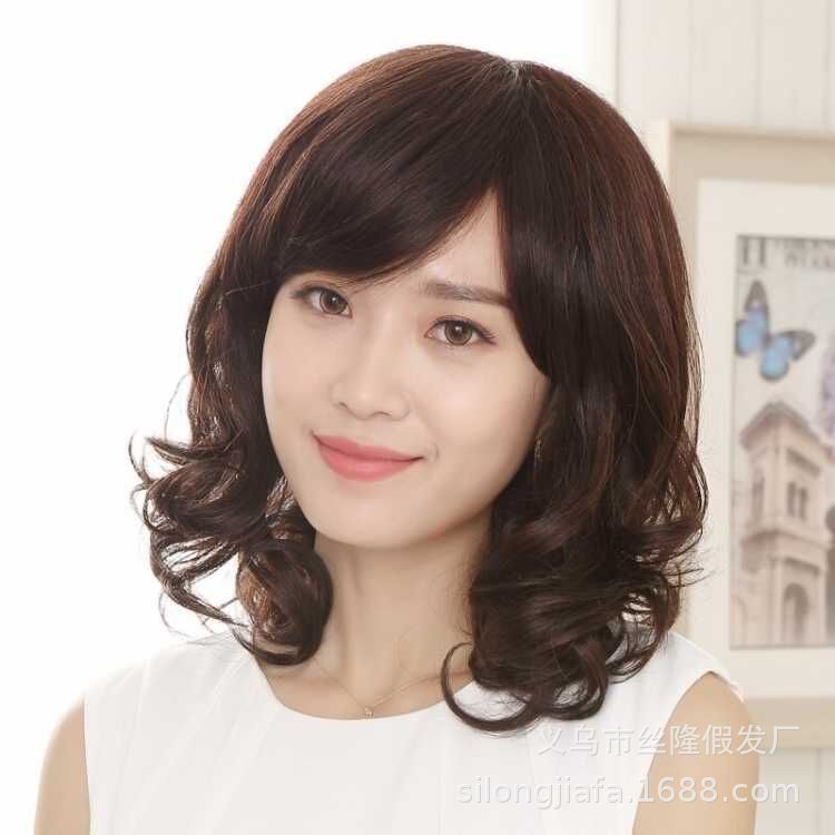 かつらの女性の中高年の女性の長い巻き髪の波の丸い顔のふわふわしている斜めの前髪のお母さんの巻き髪の全体のカバー