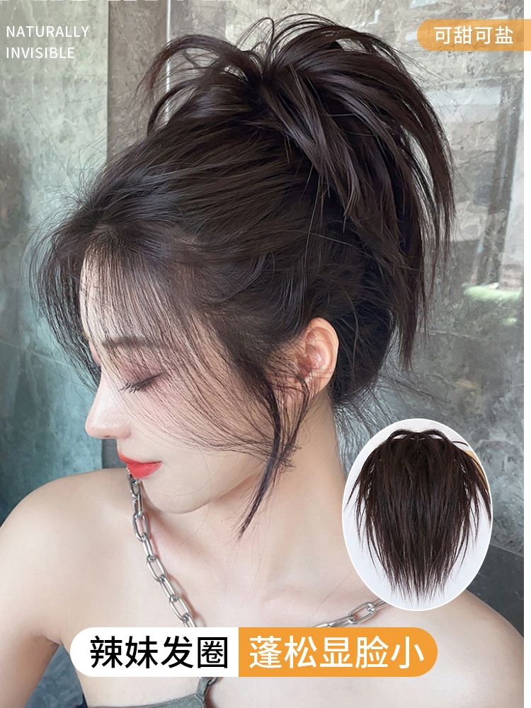 丸子のかつらの女性はシミュレーションの髪をつかんでふわふわしています。