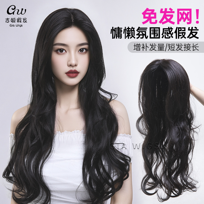 髪なしネットのかつらの中で自然な黒のカールの大きい面積のかつらを分けてプリンの頭を隠して増加量を増加します。