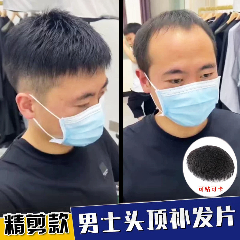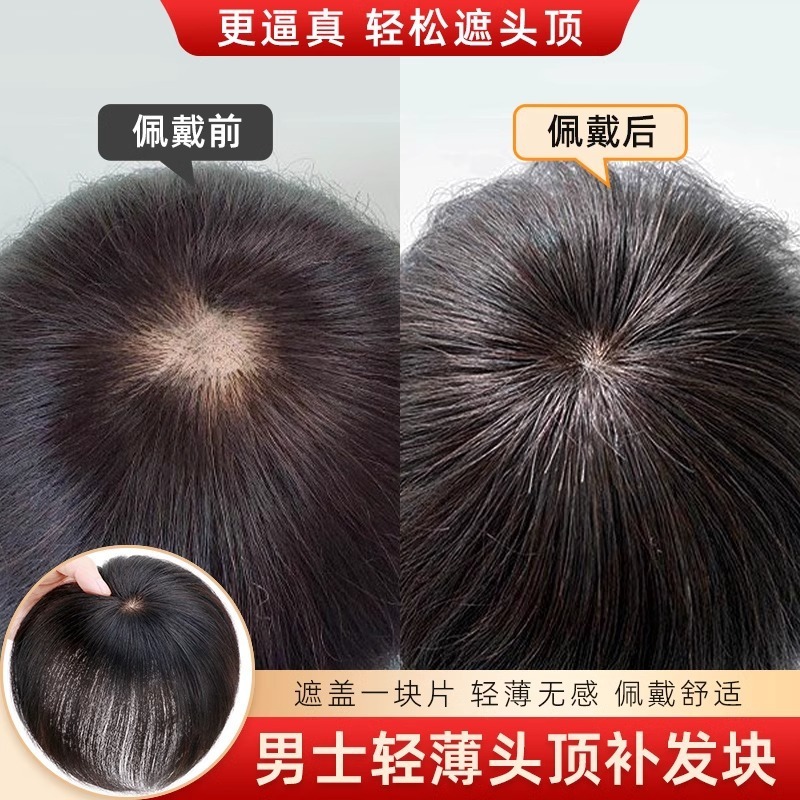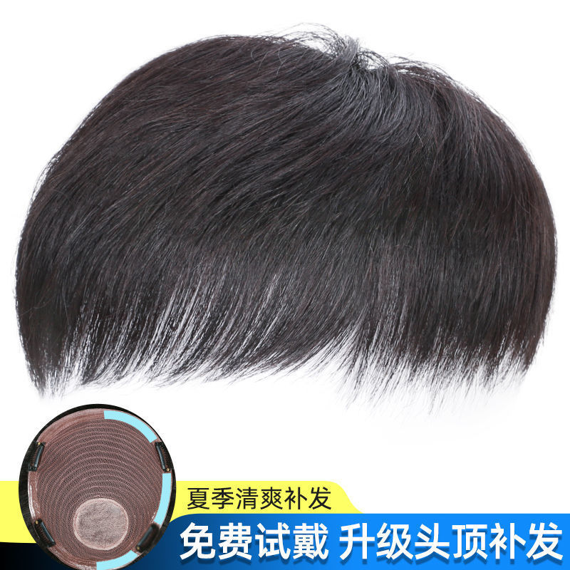 男性用ショートヘアウィッグ、フルリアルヘアウィッグ、自然に見えず跡が残らない、軽くて薄い男性用頭頂部ヘアピース